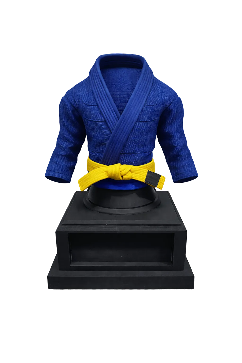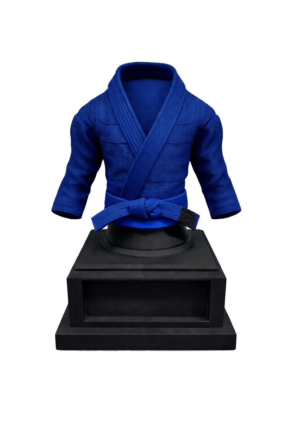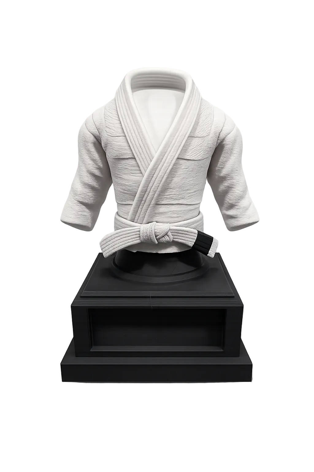 Crafted using professional 3D printing technology in PLA, the combo features a classic BJJ gi mounted on a sleek black base, paired with a vertical belt display that showcases all ranks from white to black. Personalize the trophy with your name and gym to make it truly yours.